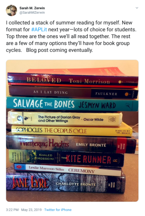 Let’s remember the mission of #DisruptTexts. It has two prongs: 1) Challenge the traditional canon to make it more inclusive and 2) anti-racist/anti-bias teaching practices. I hope that our list of texts (required and choice) is moving toward more inclusivity, and we will keep pushing in that direction. I also hope that the increased choice in the structure of the class will make for more inclusive instruction. I’ll keep reading and listening and learning, talking with my colleagues, questioning my own stance and biases, and looking for places to be better. This is ongoing work, a long-term commitment. And I’m in.
